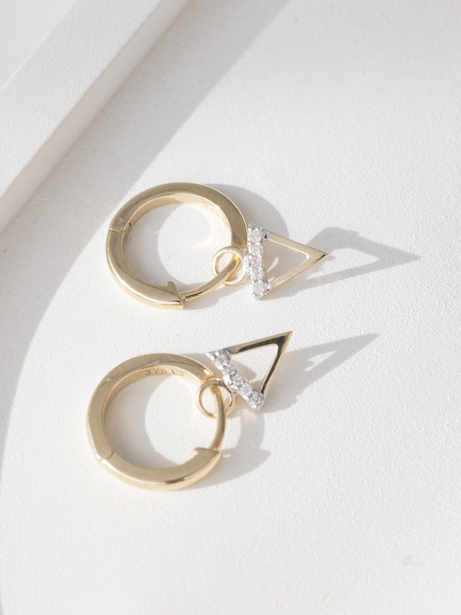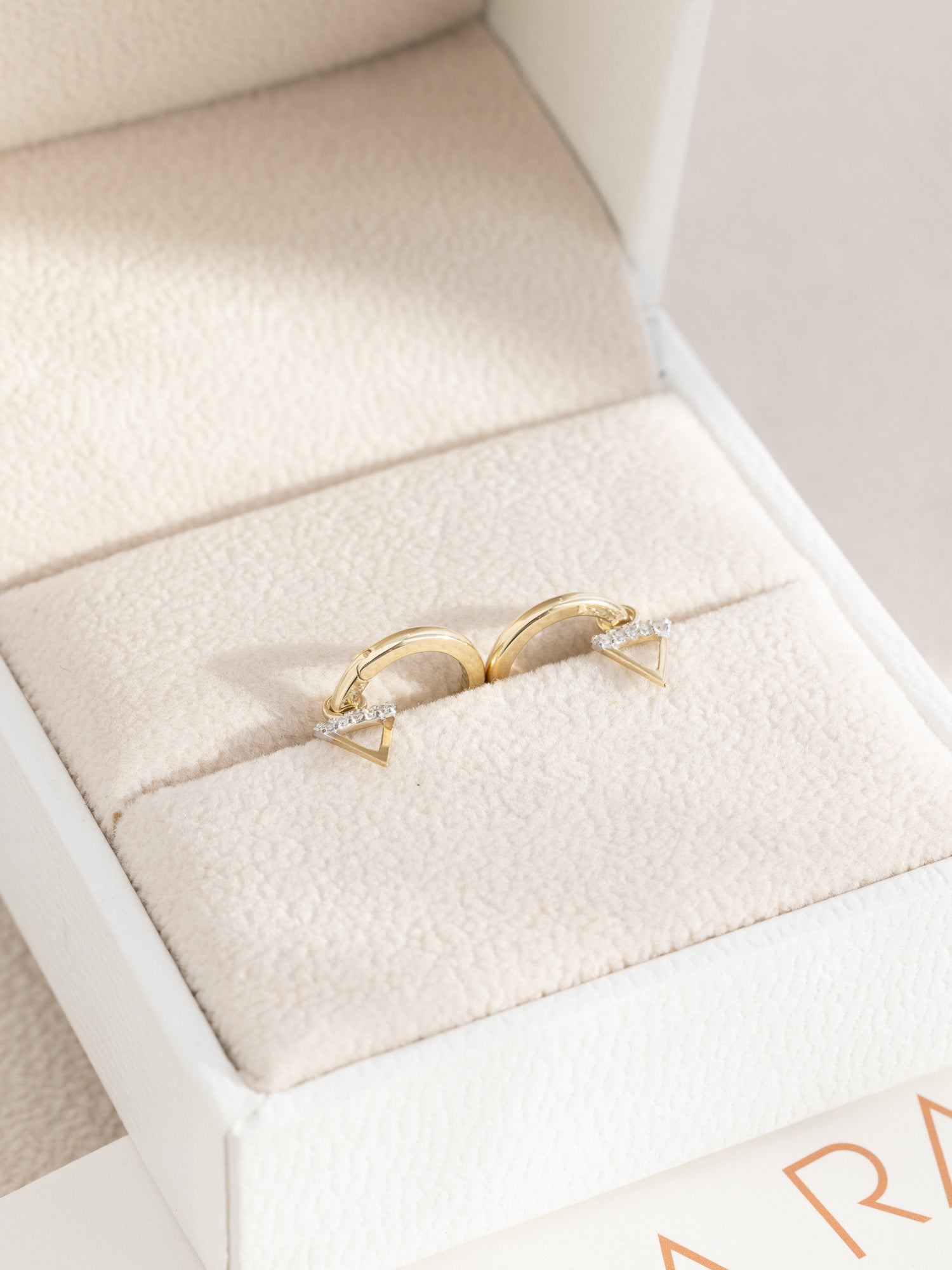 The hoops feature an Earth triangle charm in solid 9K gold that points downwards towards the ground, adorned with a line of delicate white diamonds that embody the essence of Earth.