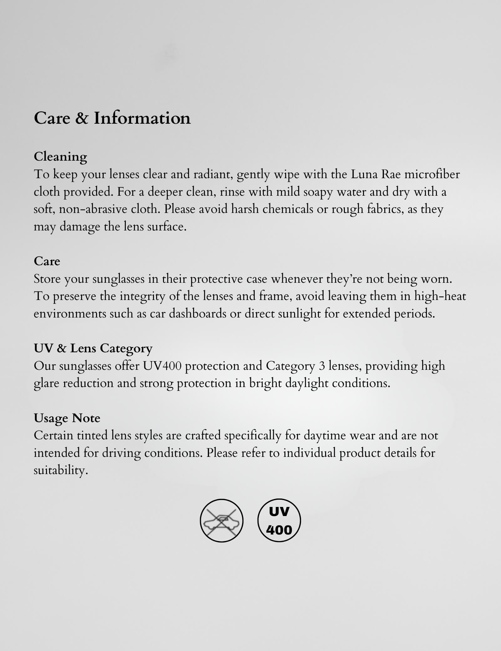 Our Luna Rae frames are made for repeat wear — thoughtfully designed, beautifully balanced, and effortless from every angle. The sort of piece you reach for on the way out the door and keep on long after the sun dips.