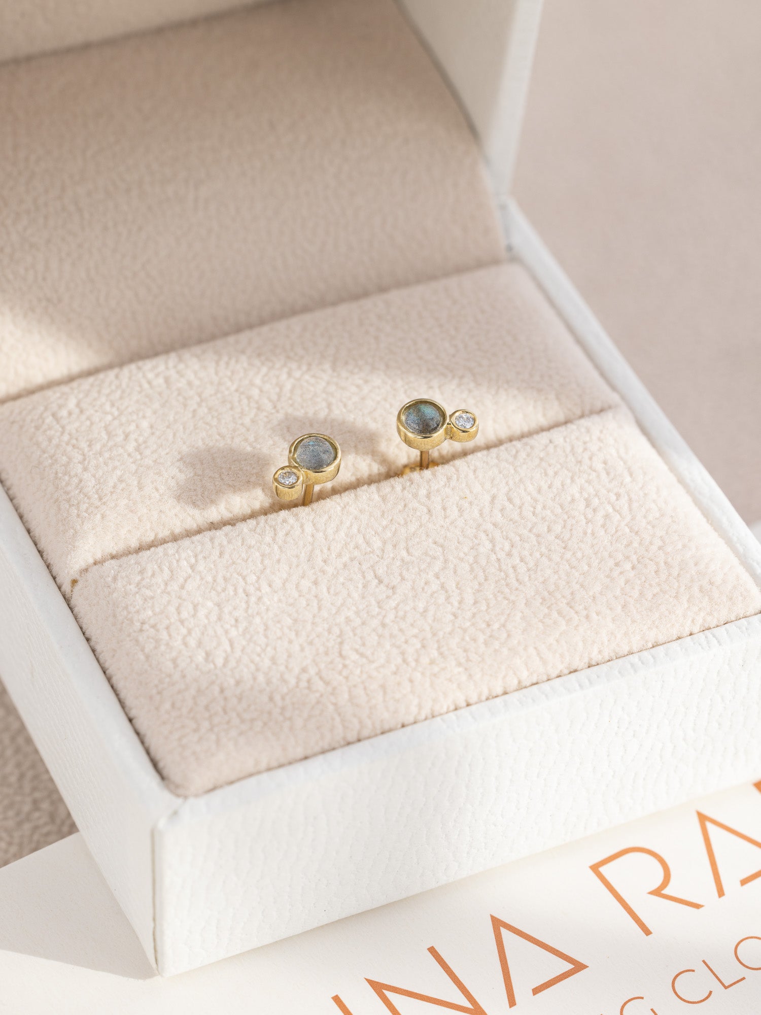 • Labradorite and Diamond Accents: each earring feature a 3.5mm labradorite stone and a 0.03ct diamond, adding a unique blend of natural beauty and sparkle.