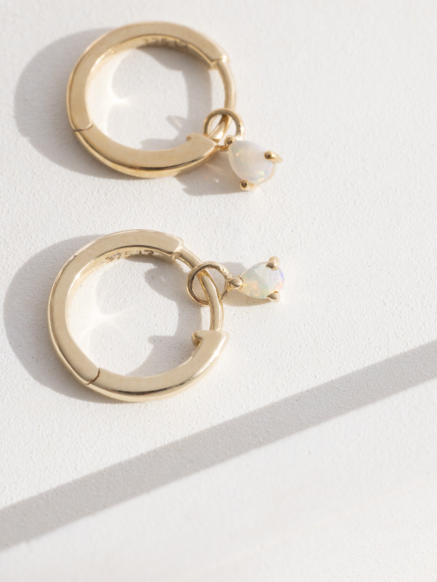 The Venus Earrings are an embodiment of love, beauty, passion, and touch, a perfect symbol of your relationships and a balancing element for work, love, and friendships. Featuring delicate Australian Opals that hang on solid 9K gold huggies, these earrings have an open claw setting that allows light to shine into the opal, enhancing its beauty.