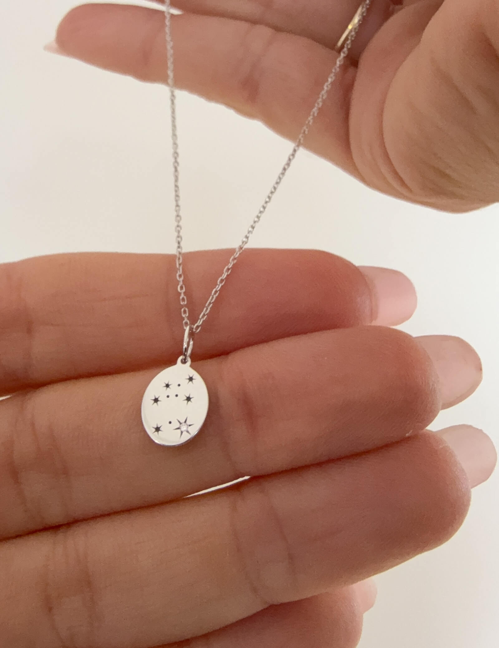 The pendant represents the constellation pattern, crafted from solid 9K white gold with a single white diamond.