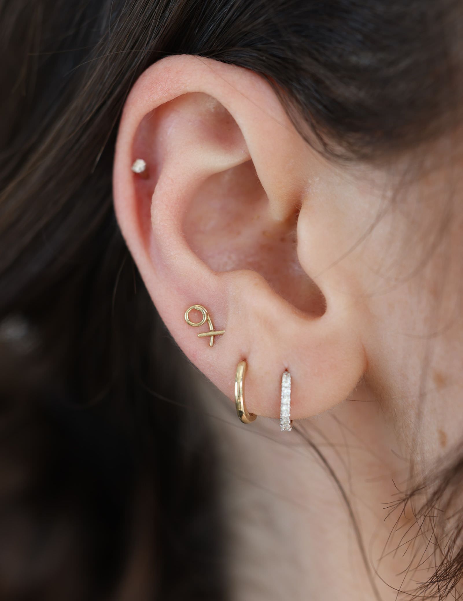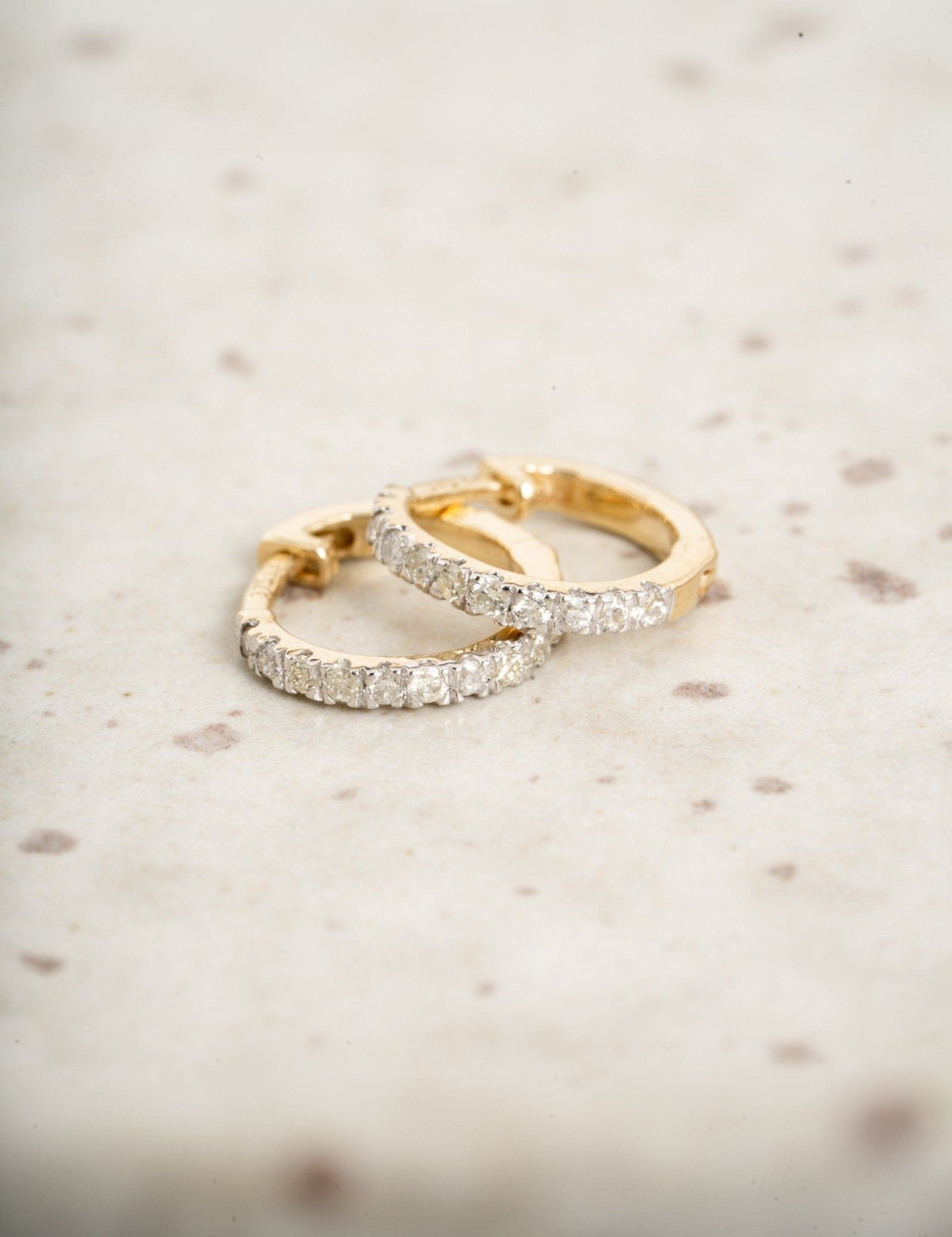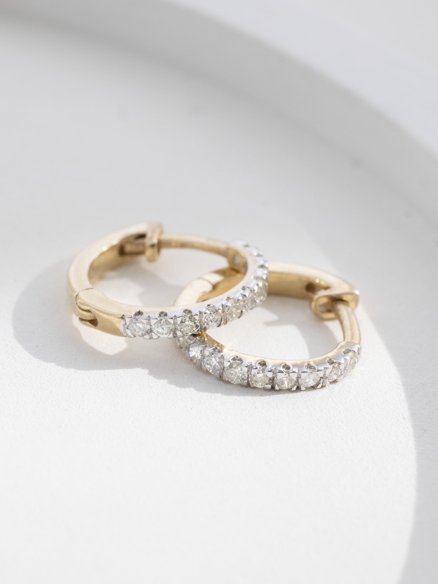 Discover the understated beauty and timeless elegance of Audrey Huggies. Crafted from Solid Gold and adorned with small white brilliant cut diamonds, these earrings embody simplicity and sophistication. With their refined design and versatile appeal, Audrey Huggies are the perfect accessory for elevating your style.
