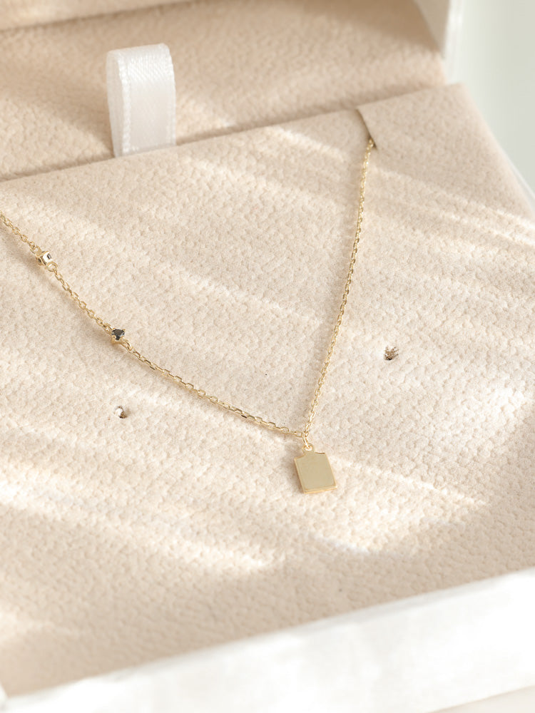 The diamonds are elegantly placed within a solid 9K gold chain and accentuated with a matte brushed rectangle pendant, exuding a sense of passion and true originality.