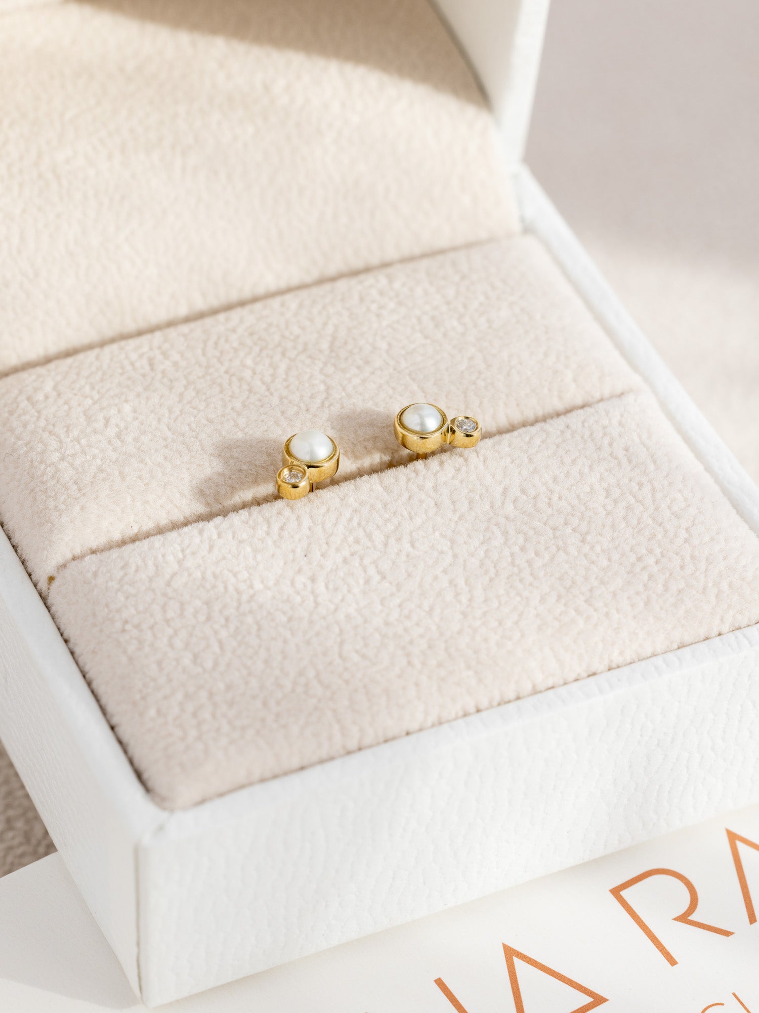 The studs showcase a beautiful freshwater pearl and a natural, conflict-free diamond, symbols of purity, love, and rare treasures that are meant to last a lifetime.
