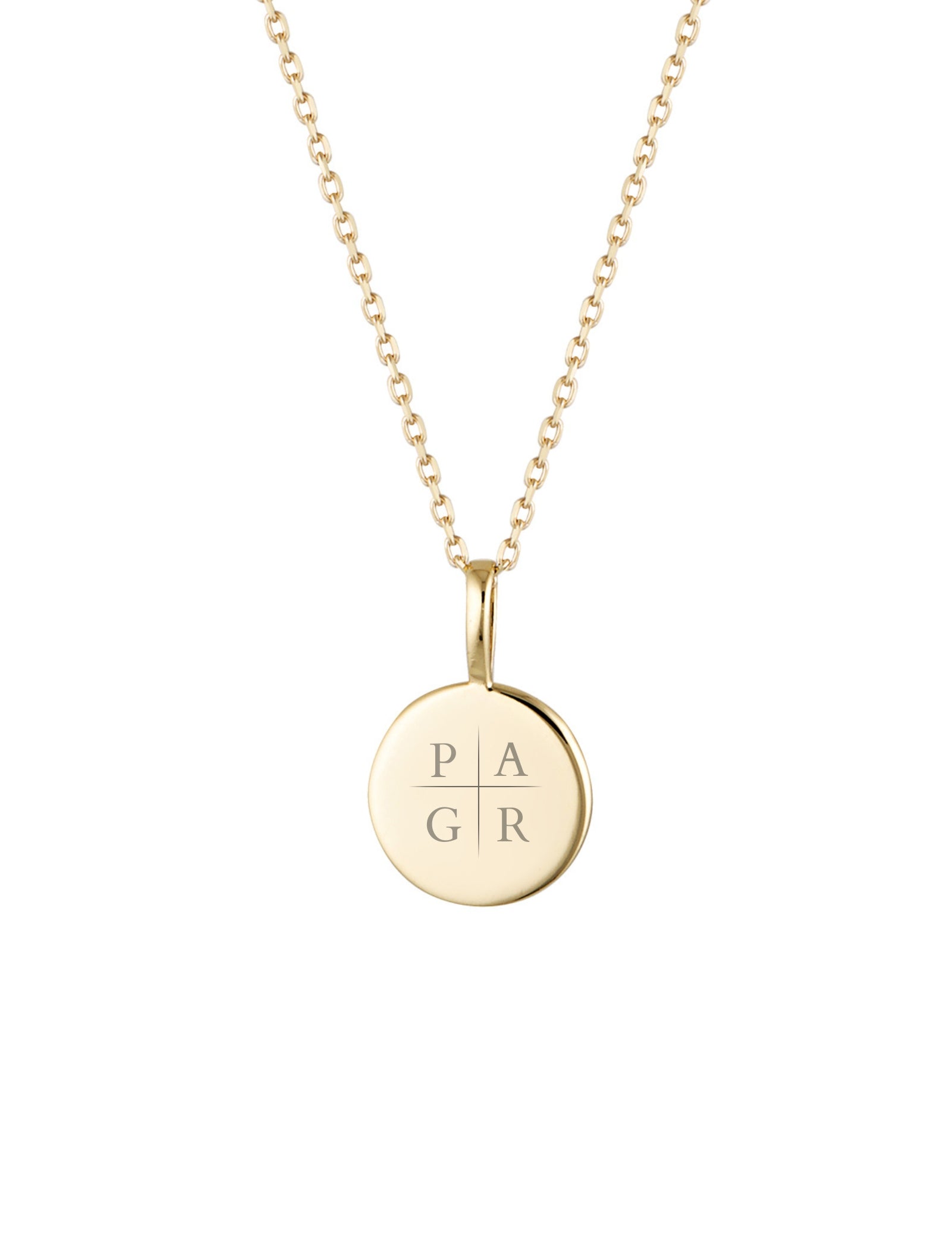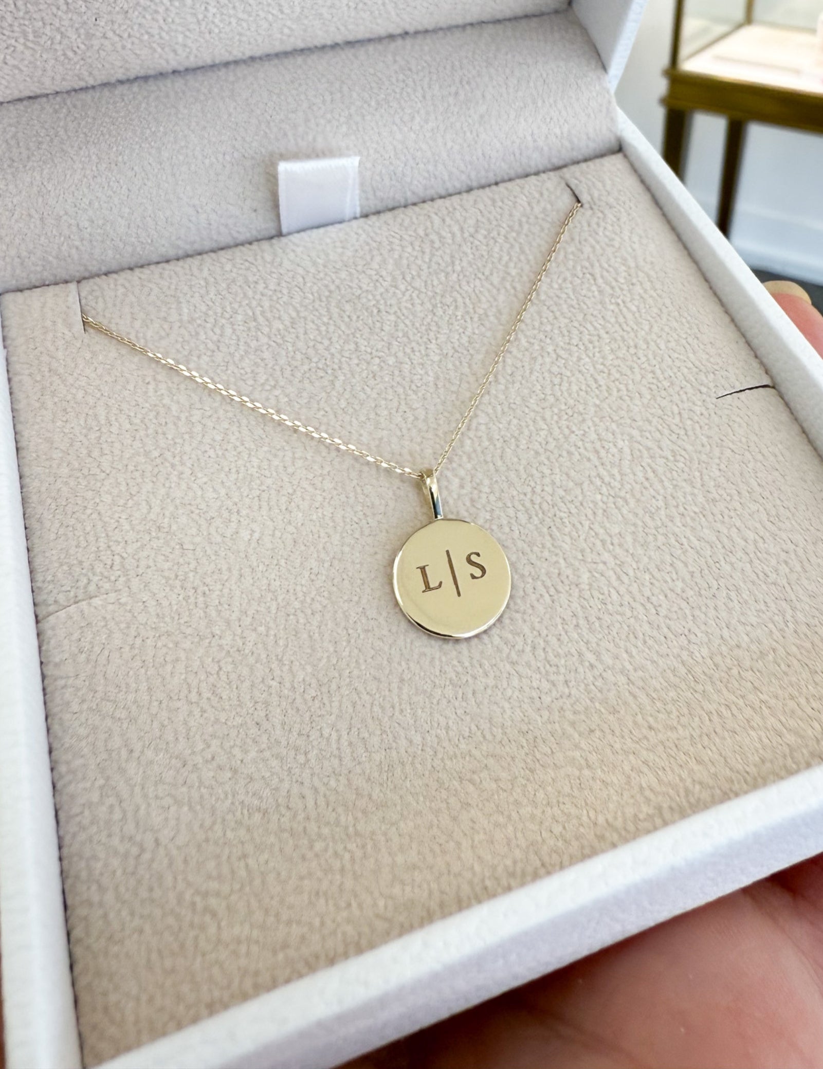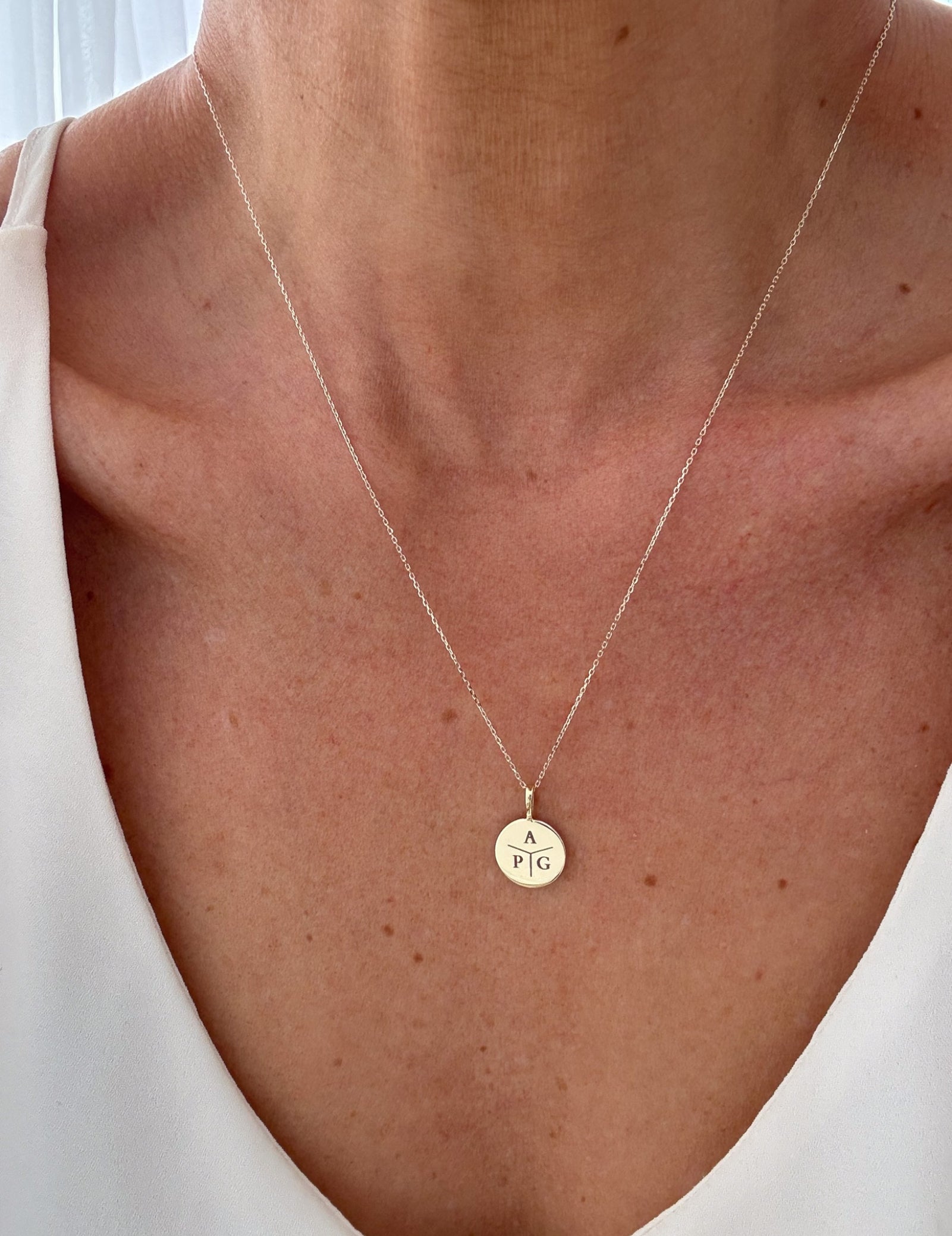 The Family Initial Pendant measures 12 mm in diameter and 0.8 mm in thickness, with a 4.7 mm bail height. It is lightweight and perfectly sized for stacking, engraving, or wearing solo as a timeless, organic accent