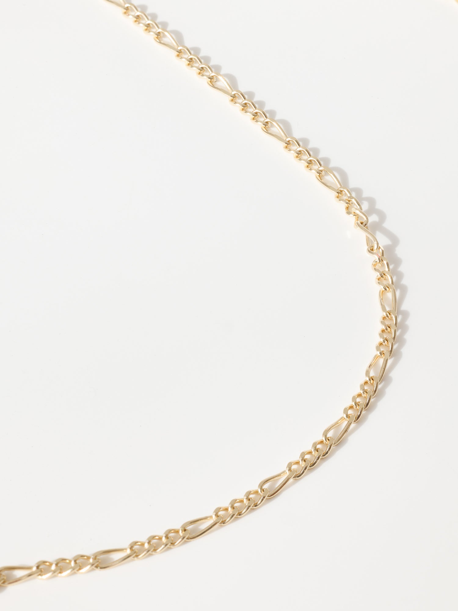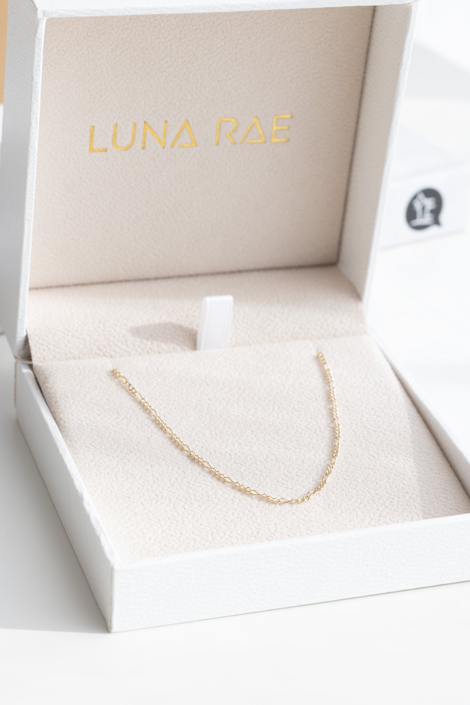 The Figaro Chain is available in 40cm and 45cm lengths, offering a Solid Gold Figaro style that embodies timeless chic. This thicker style chain can be worn alone or stacked with Luna Rae charms for a versatile look.