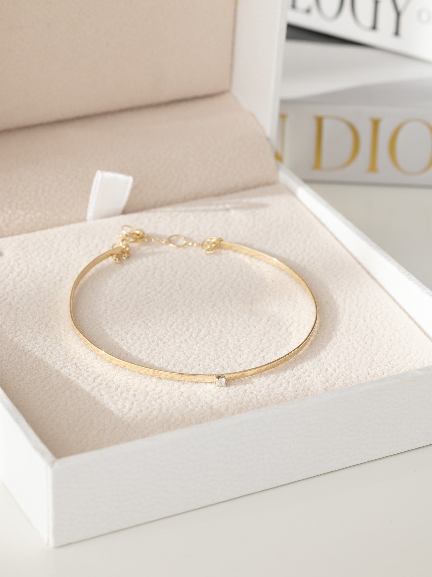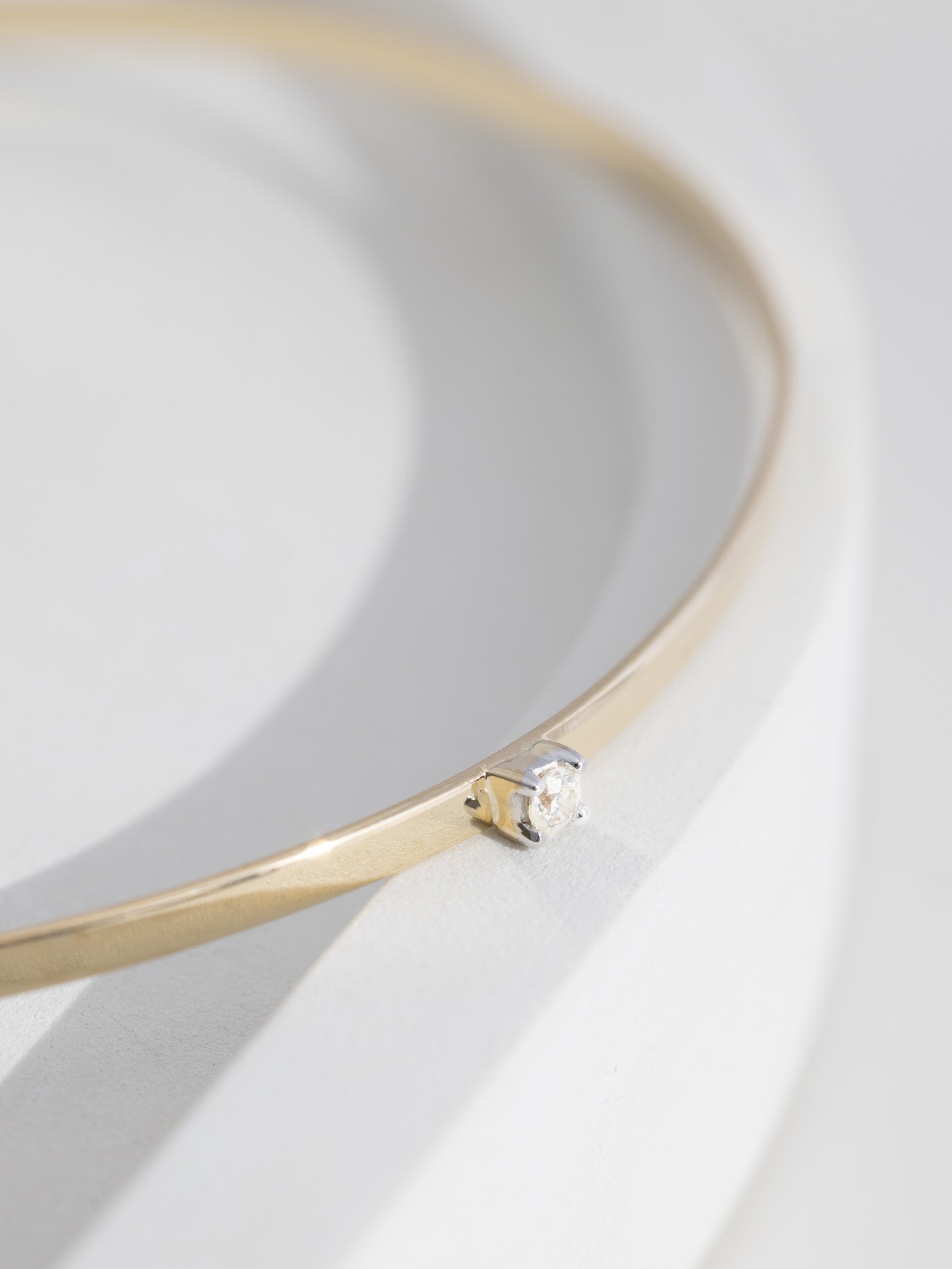 The bangle is finished with flattened gold and a perfect white diamond in the center, making it a cherished piece to keep forever.