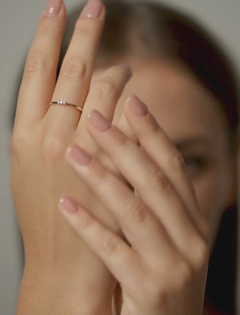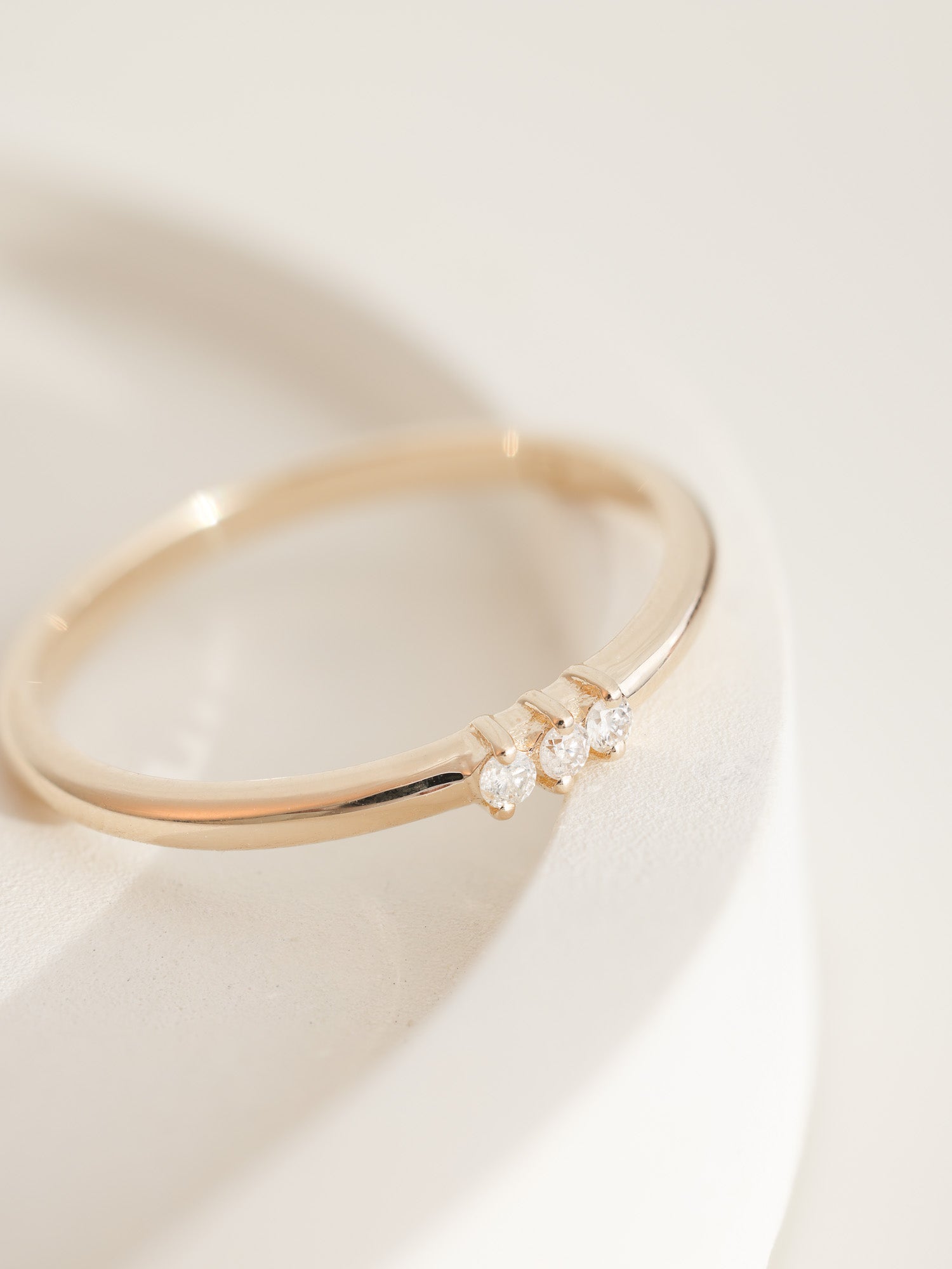 The Juliette Ring features a 2mm thick gold band and three 1.5mm brilliant-cut natural diamonds with a total diamond weight of .045ct. Crafted from 9k solid gold, the ring weighs approximately 1.3 grams. Available in three sizes: small (size 6, 16.3mm internal diameter), medium (size 7, 17.1mm internal diameter), and large (size 8, 17.9mm Internal diameter).