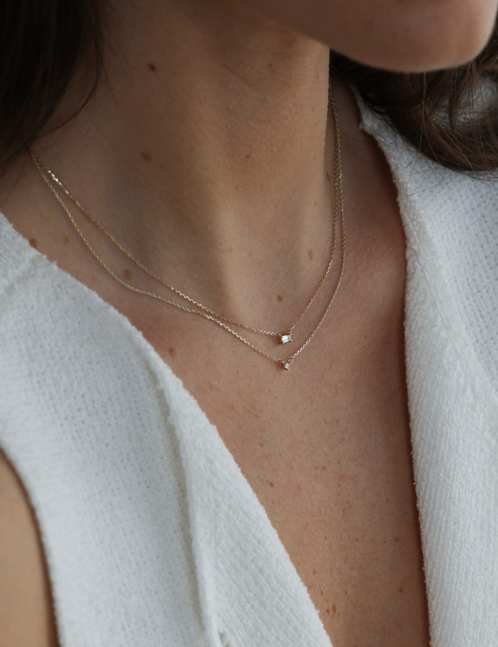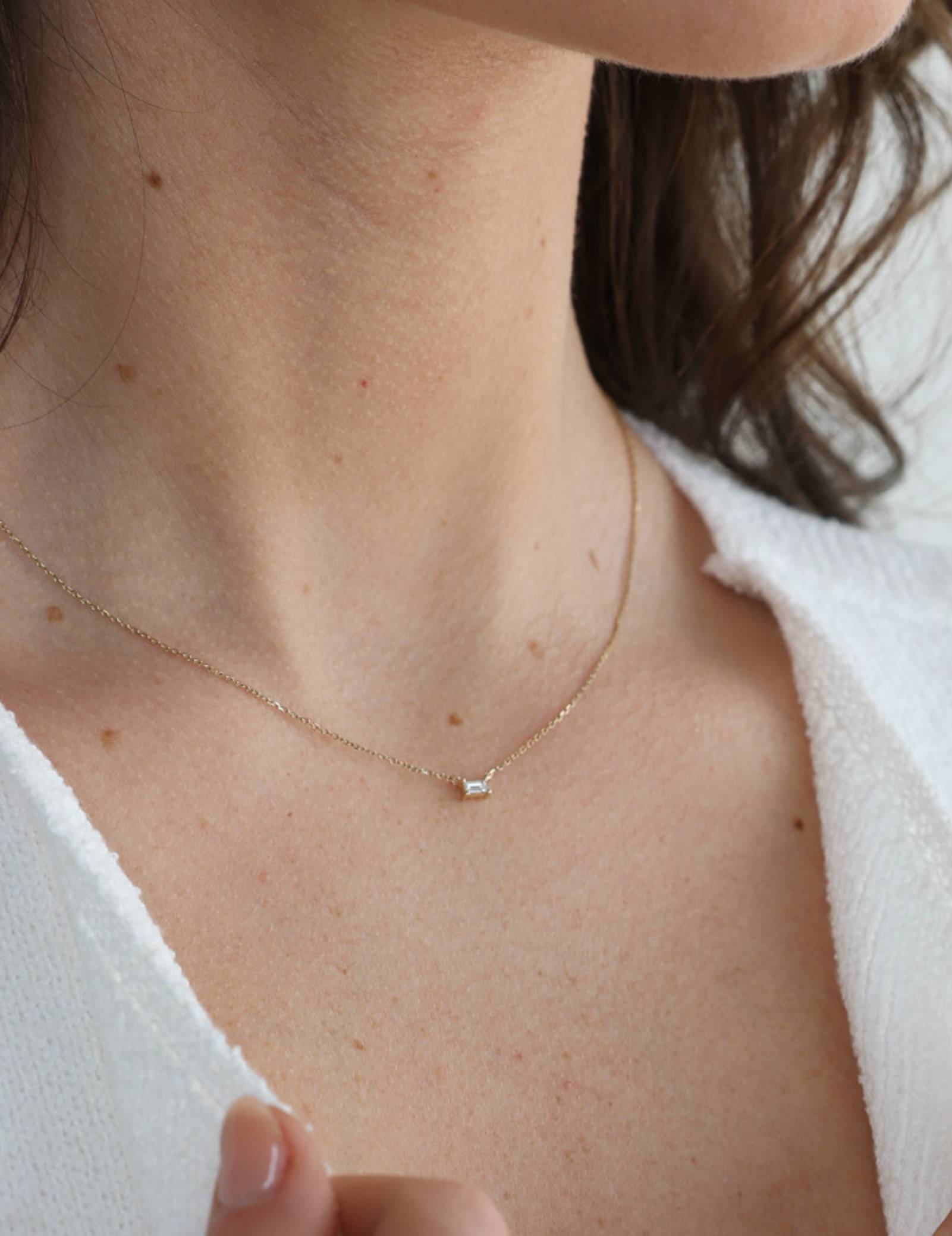 The baguette cut, known for its clean lines and simplicity, symbolizes clarity and precision. Whether worn as a standalone piece or layered with others, the Lumi Necklace is a staple of effortless sophistication, perfect for adding a subtle sparkle to any outfit.