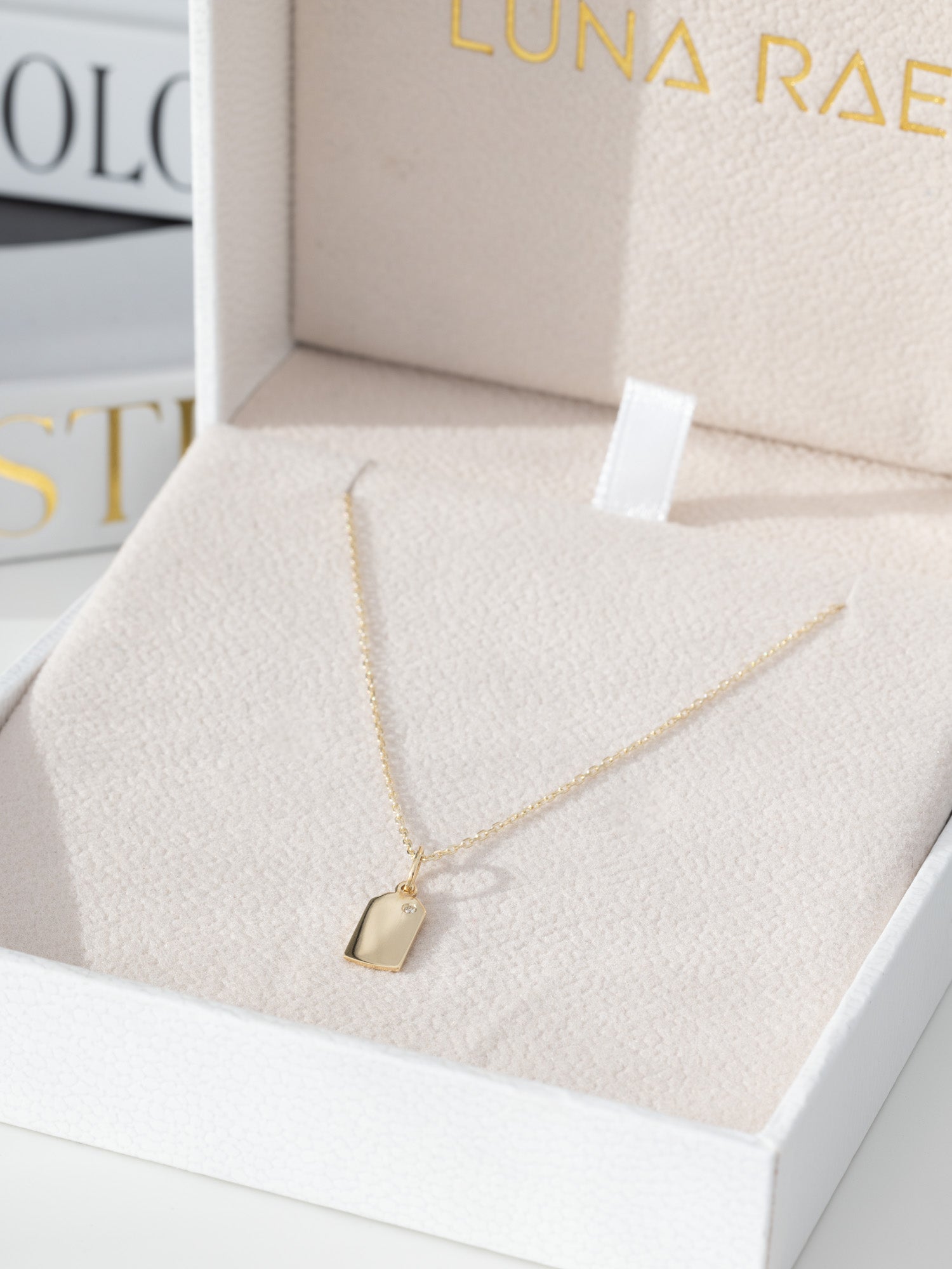 Light up your day with the Luminous Necklace. This brilliant tag-style pendant is designed to radiate and reflect light, bringing brightness and courage into your life. Crafted from solid 9K gold and finished with a single white diamond, this necklace carries the energy of angelic beings that surround us every day.