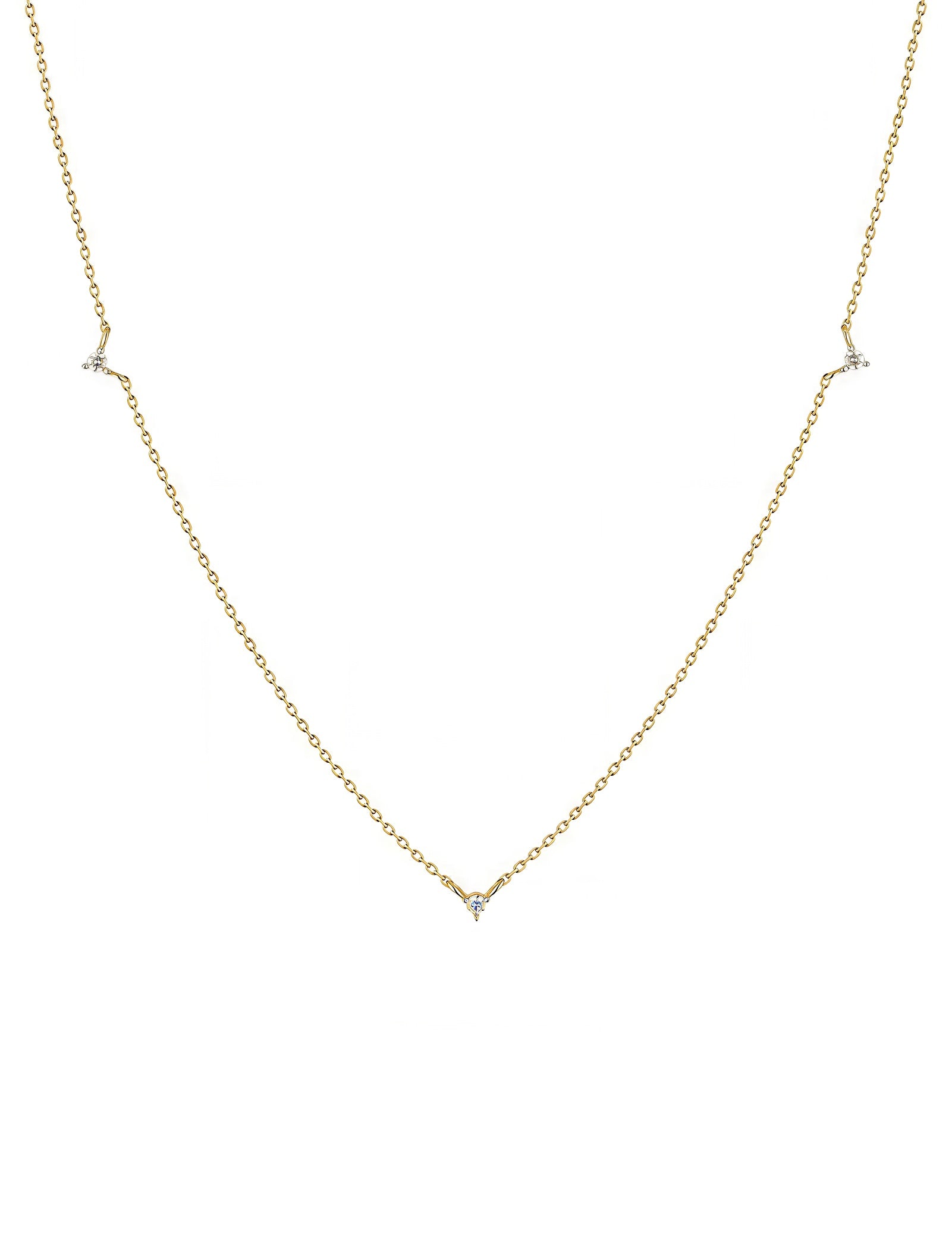 The Petite Diamond Trio Necklace has a total gold weight of approximately .988 grams. Each diamond is 1.70mm in size totalling 0.06 carats. With a 40 cm length, this necklace provides a delicate touch of grace and versatility, perfect for enhancing your daily style or adding a subtle sparkle to any occasion.