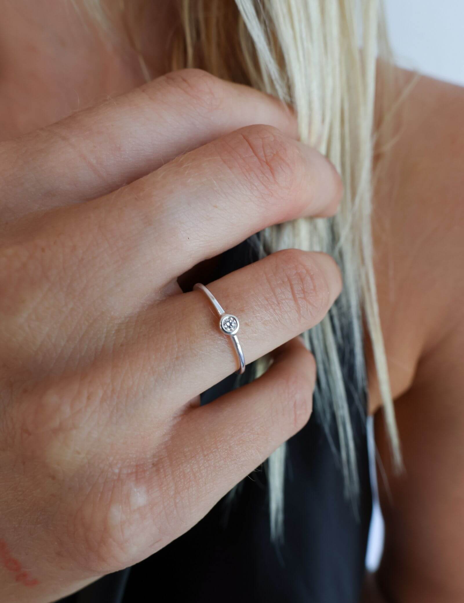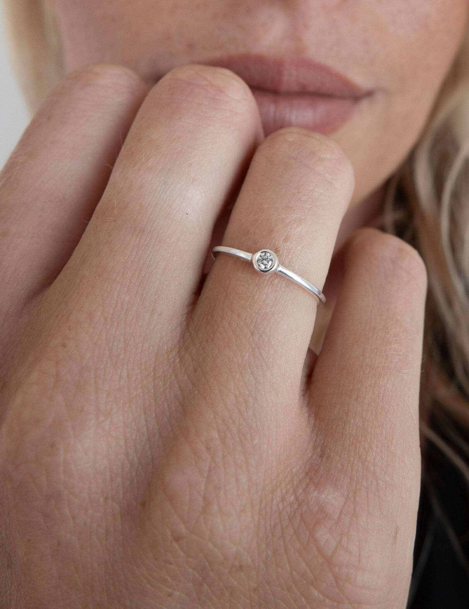 The Diamond Sky Ring is crafted from sterling silver with a band that is 1.2mm wide. It features a brilliant-cut white diamond that is 3.4mm in size (.045ct). The ring is available in three sizes: small (size 6, 16.3mm internal diameter), medium (size 7, 17.1mm internal diameter), and large (size 8, 17.9mm Internal diameter).