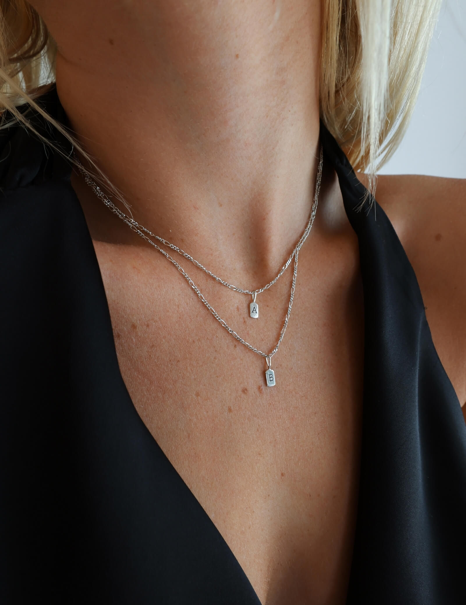 The delicate typewriter-style font allows it to hang as a single charm or be layered with other Luna Letters, creating a personalised piece. Available as a standalone charm or with a silver chain of varying lengths, it's a lightweight yet distinctive accessory.