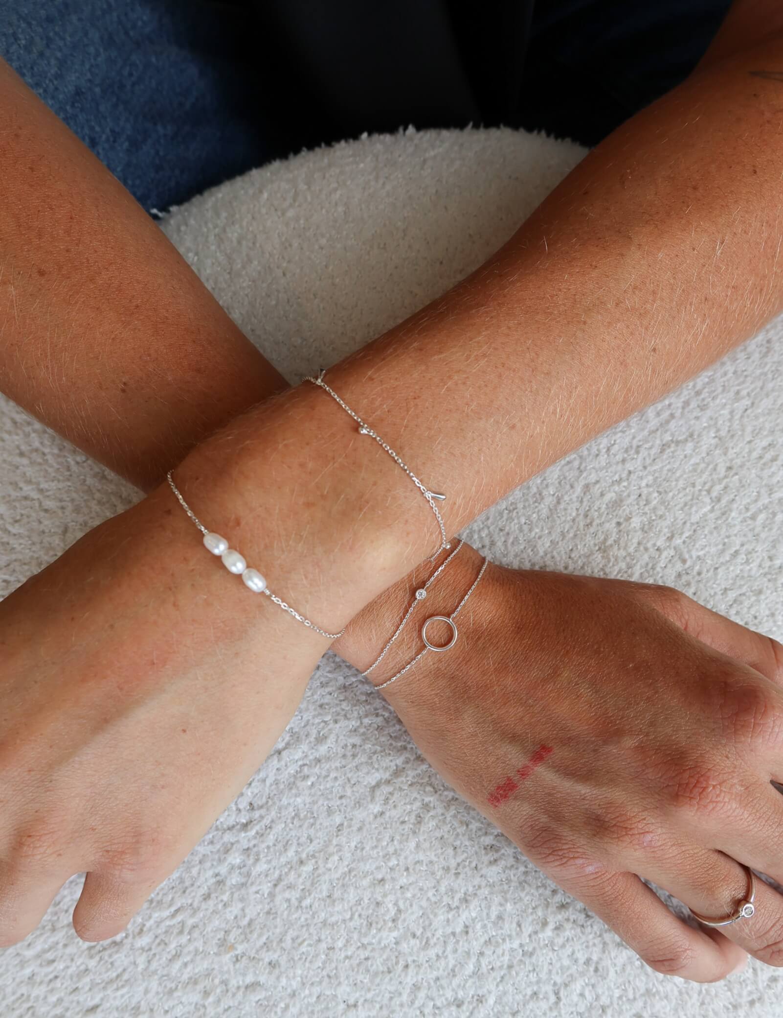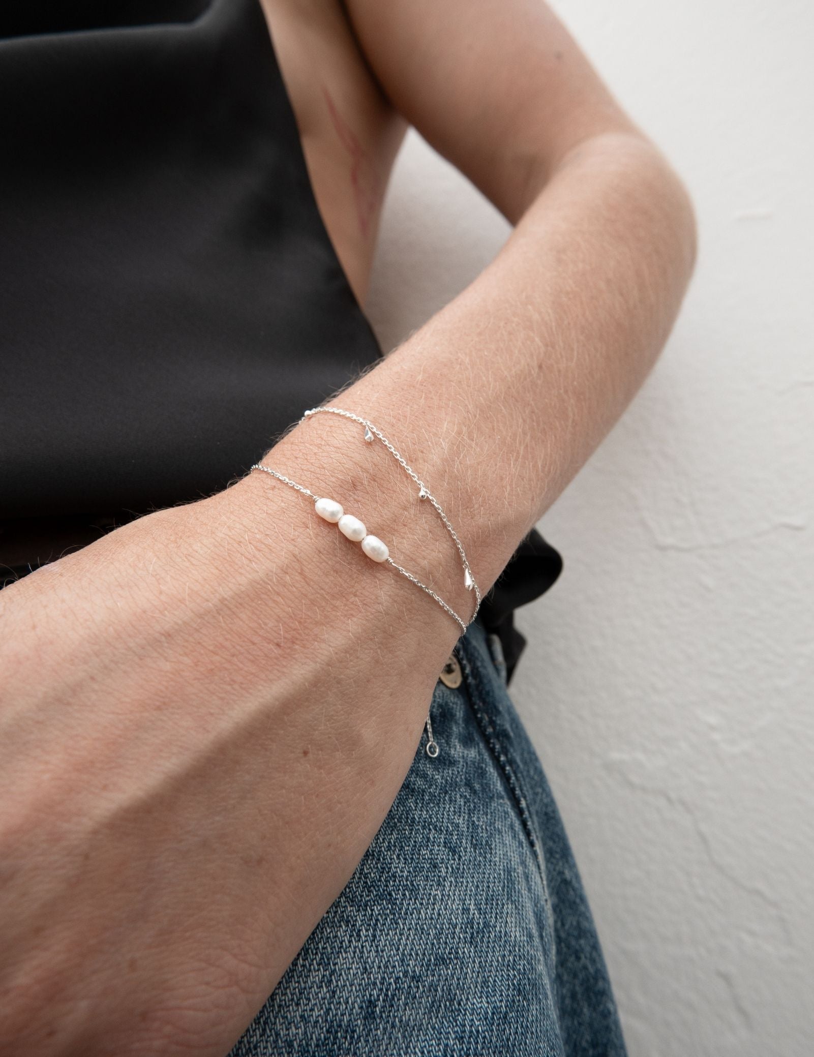 A pretty little string of pearls makes for the perfect accessory. The Margot Bracelet features a delicate chain crafted from sterling silver, adorned with three lustrous Freshwater Pearls. This bracelet effortlessly combines elegance and charm, adding a touch of sophistication to your wrist.