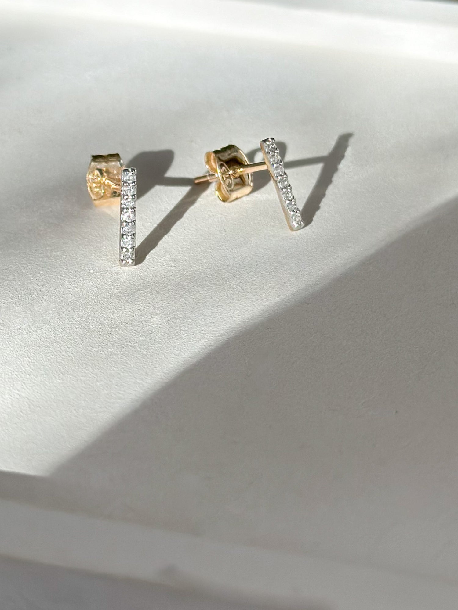 Simplicity meets elegance with our Sophia Studs. Crafted from Solid 9K Gold, each stud features a bar adorned with seven shimmering diamonds, exuding timeless allure. Offering versatility, they can be purchased individually or in pairs, making them a perfect addition to your jewellery collection for any occasion.