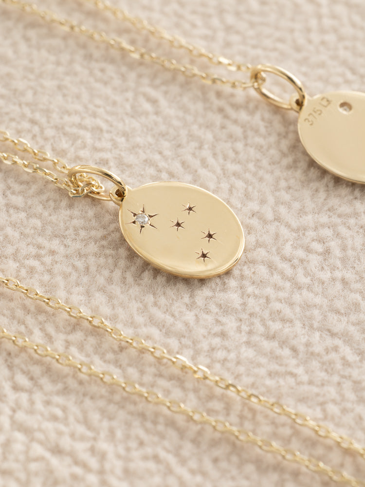 The pendant depicts the constellation pattern, fashioned from robust 9K  gold with a single white diamond marking the Nashira star.