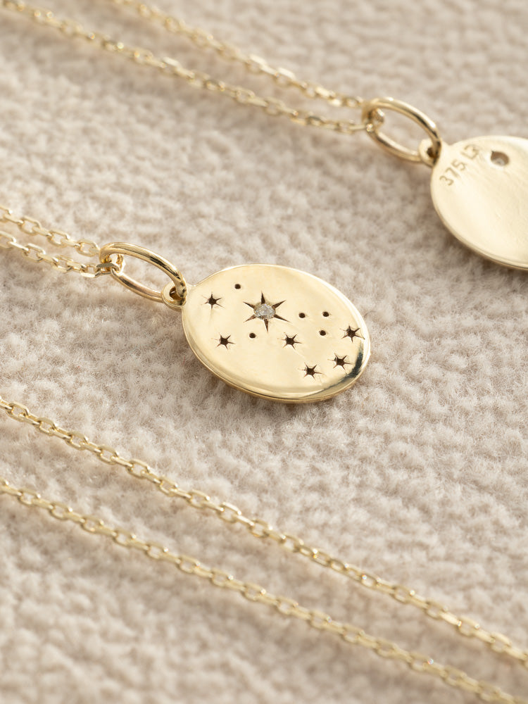 The pendant depicts the constellation pattern, fashioned from solid 9K gold with a single white diamond marking the Porrima star. Available with a 40 - 45 cm necklace with 5 cm extension, this necklace is versatile, significant, and personalized to your astrological sign.